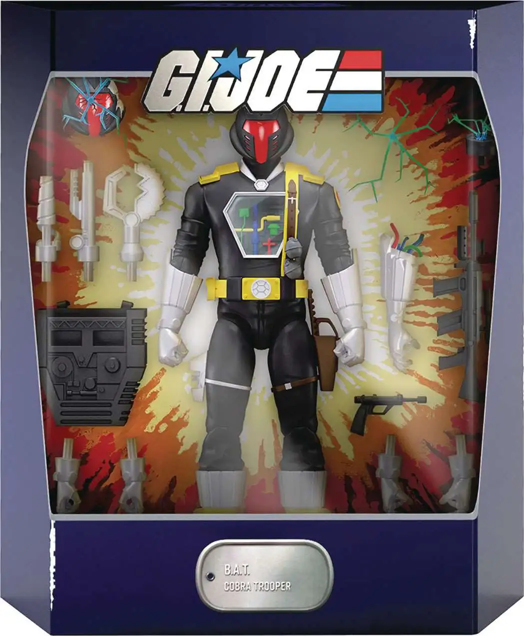 From Super7. They may lack the over-the-top dramatic flourishes exuded by many of Cobra’s notable characters, but Cobra Battle Android Troopers (B.A.T.) more than make up for that in their ability to unleash pure battlefield carnage and mayhem! The made-to-order 7″ scale fully articulated G.I. Joe ULTIMATES! figure of the Cobra B.A.T. comes with interchangeable heads and hands, and a variety of accessories, including battle damaged pieces, weapon attachments, multiple guns and more! Dr. Mindbender’s creation may give the G.I. Joes nightmares, but the Cobra B.A.T. ULTIMATES! figure will be a dream to have in your collection!