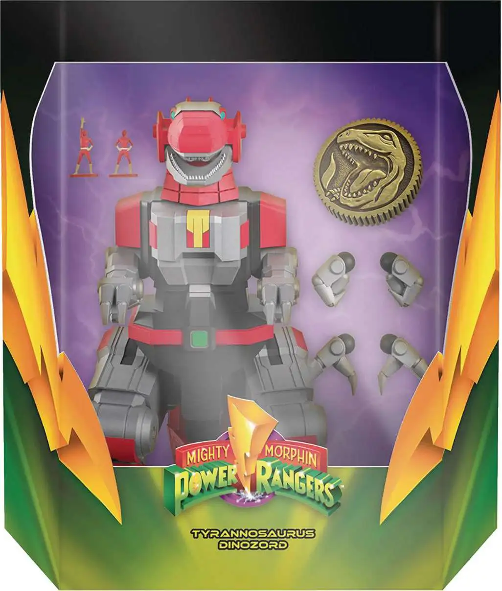 From Super7. Piloted by the Red Ranger, the Tyrannosaurus Dinozord erupts from the earth to fight the evil forces of Rita Repulsa. This mighty zord is capable of taking on Rita Repulsa’s Evil Space Aliens one-on-one! In combat, it uses its tail to hold its body up and deliver a devastating kick, and one roar can vaporize any opponent. This highly detailed, fully articulated deluxe Tyrannosaurus Dinozord ULTIMATES! figure stands 8″ tall (and even longer from head to tail!) and comes with a variety of interchangeable parts and accessories. It’s no tall “tail”- your MMPR collection calls for the Tyrannosaurus Dinozord ULTIMATES! figure!