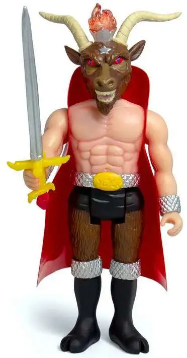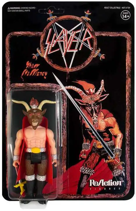 The official Super7 x Slayer 3.75-inch ReAction Figure immortalizing the demonic Minotaur from the cover of the band’s debut album, Show No Mercy. The figure includes a cape and sword accessories.