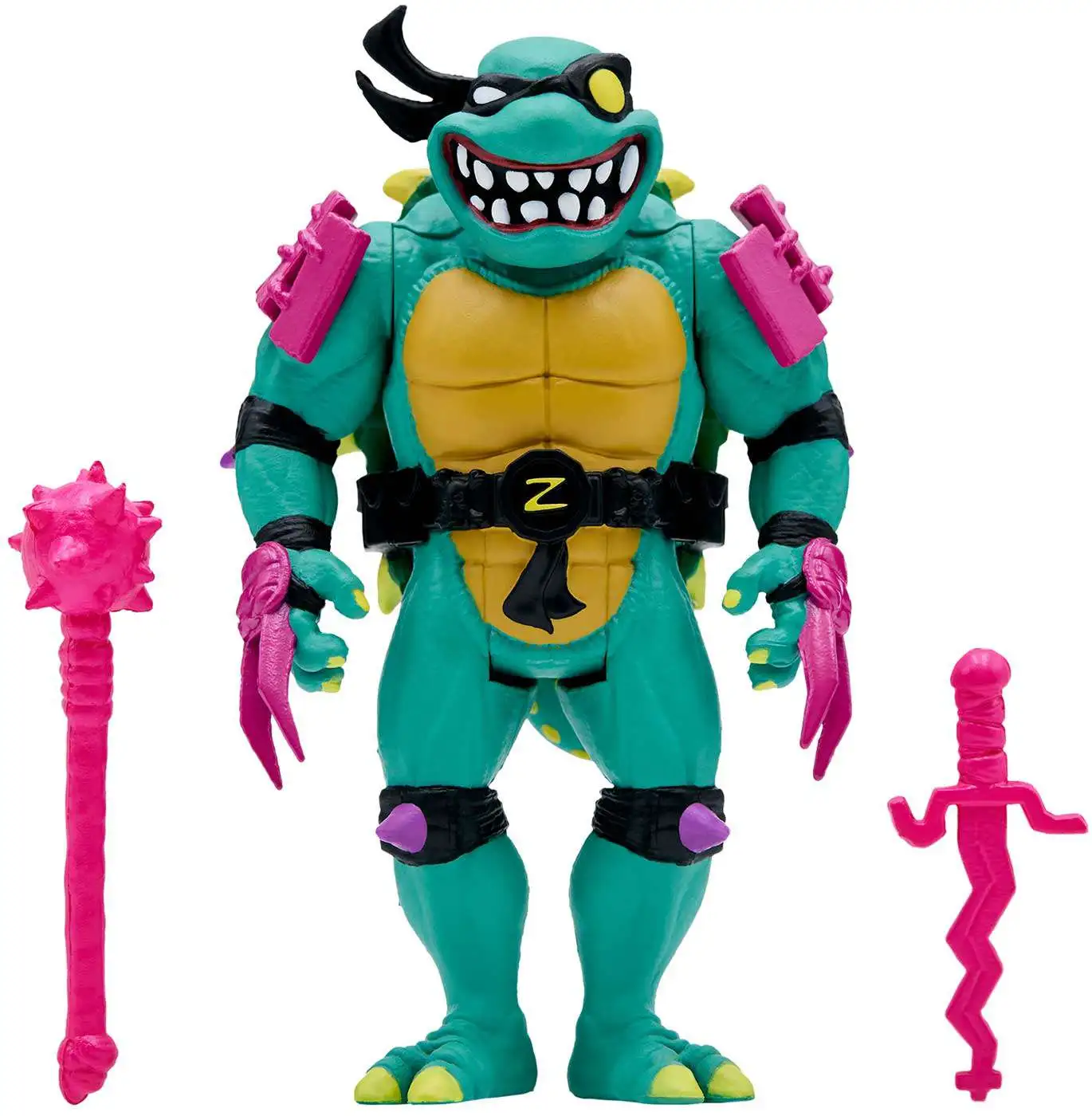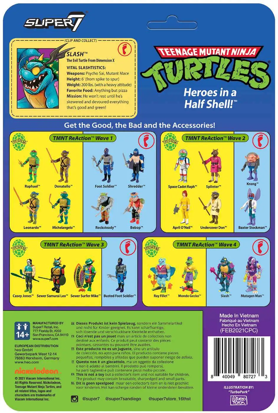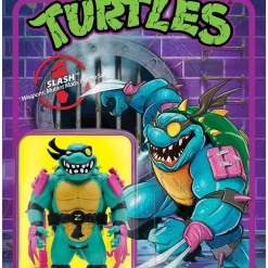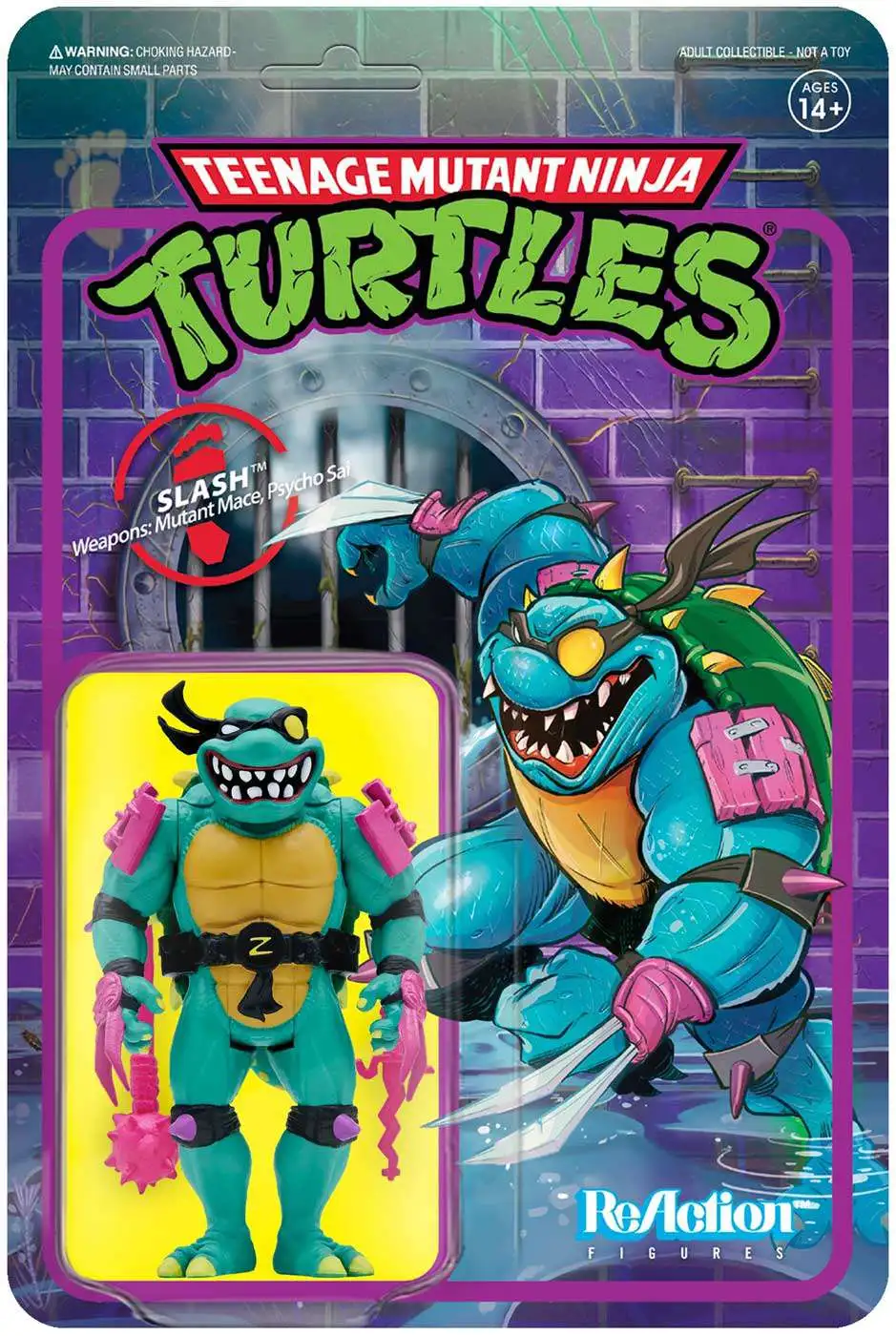 Sure, a pet is cute when its little, but once it grows up it can be a lot to handle. That is definitely true for Slash, who began as Bebops pet turtle, but once he grew up (thanks to Rocksteadys super-mutagen experiments) he became a big problem. This 3.75 articulated Teenage Mutant Ninja Turtle ReAction figure of Slash highlights his belligerent nature and comes with Mutant Mace accessory. We cant guarantee the Slash ReAction figure is going to get along with the rest of your TMNT collection, but if you keep a small plastic tree handy that will at least keep him pacified.