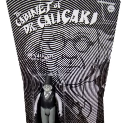 Stepping out of the hypnotic and horrifying 1920 German silent film to join the 3.75-inch ReAction Figure world: The Cabinet of Dr. Caligari! The cardback is inspired by the film’s unhinged and angular visual style. The mysterious grayscale figure comes with a removable cape.