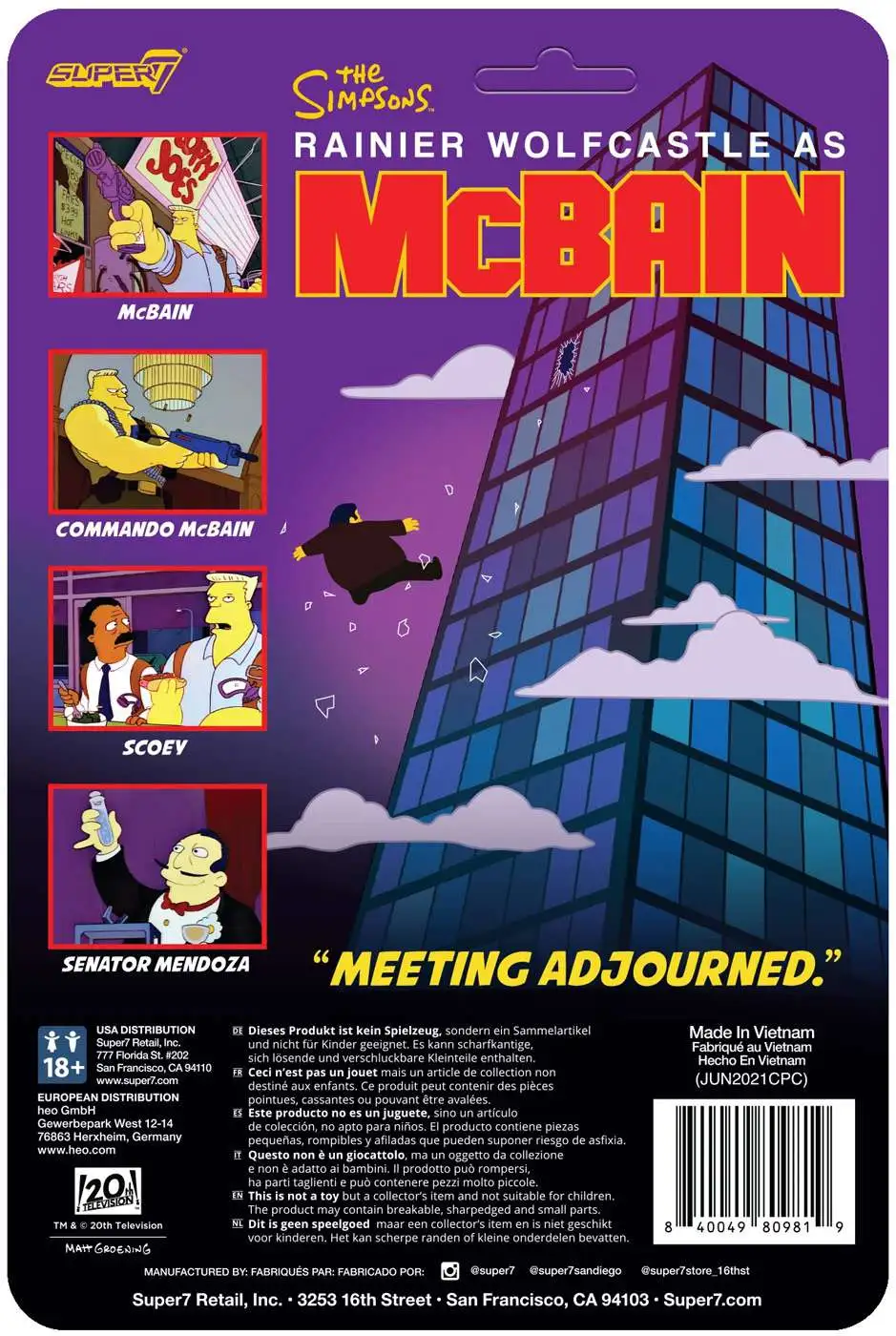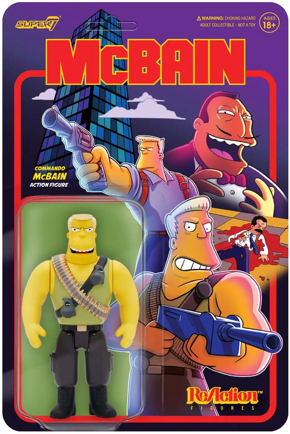 This 3.75 articulated The Simpsons ReAction figure brings back McBain in his Commando 3 outfit. He features 5 points of articulation and is packed on retro blister card packaging.