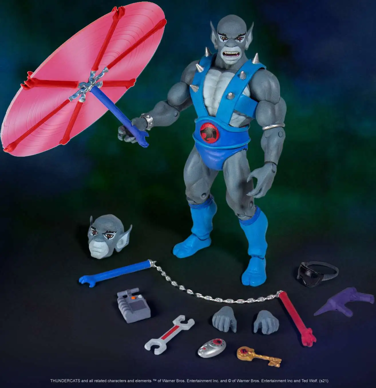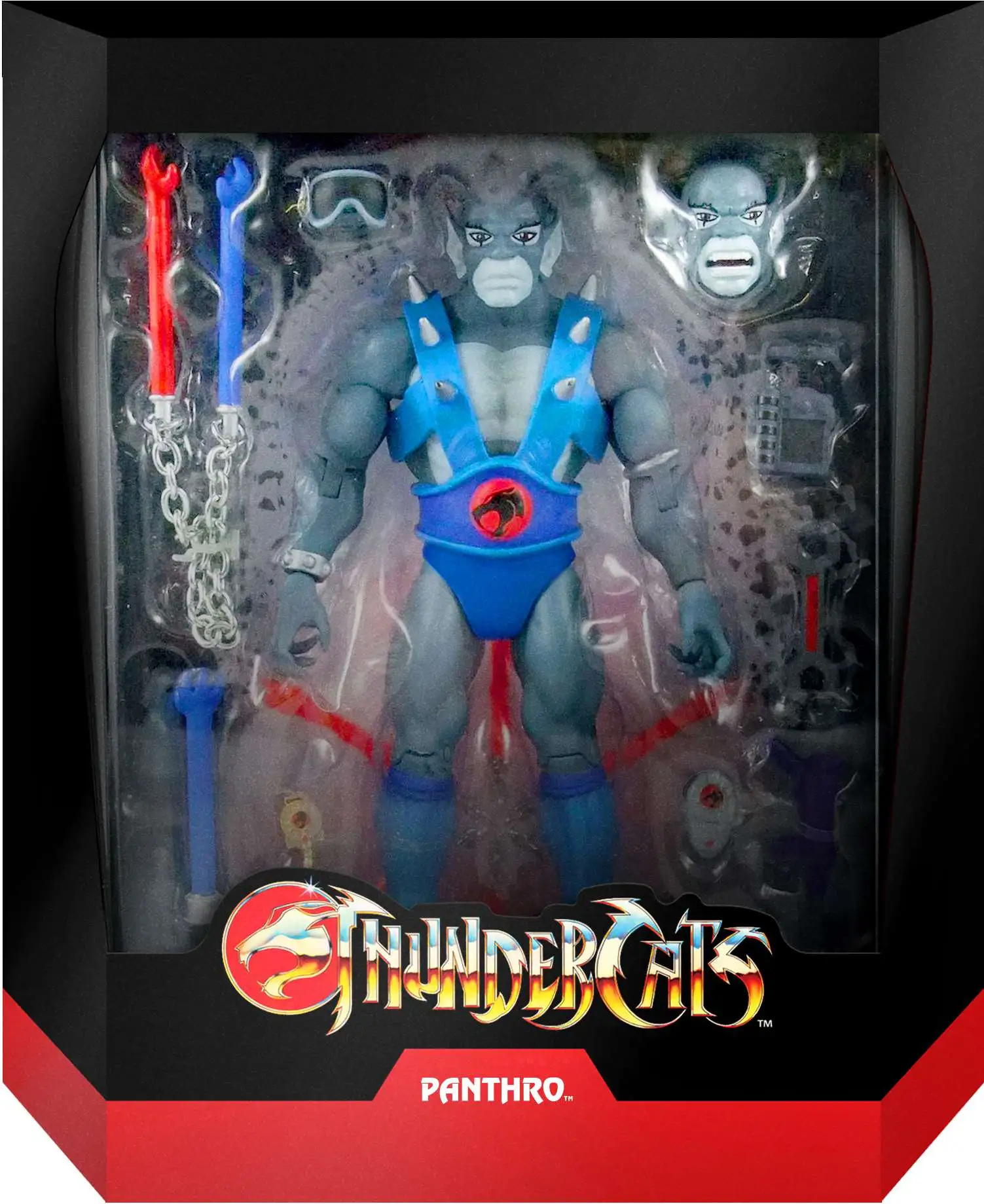 From Super 7. With the Ultimate ThunderCats from Super7 you can relive the excitement of the classic ThunderCats cartoon like never before. Each 7-inch super-articulated deluxe action figure comes straight from Third Earth to you! Each figure includes a variety of interchangeable parts and accessories in sleek deluxe packaging. This version of panthro includes: Nunchucks with real chain, Spinning Nunchucks, Thundrometer, Key of Thunera, Wrench, Welding Gun, Goggles, Detonator, Communicator, Interchangeable Hands, and an Interchangeable Head!