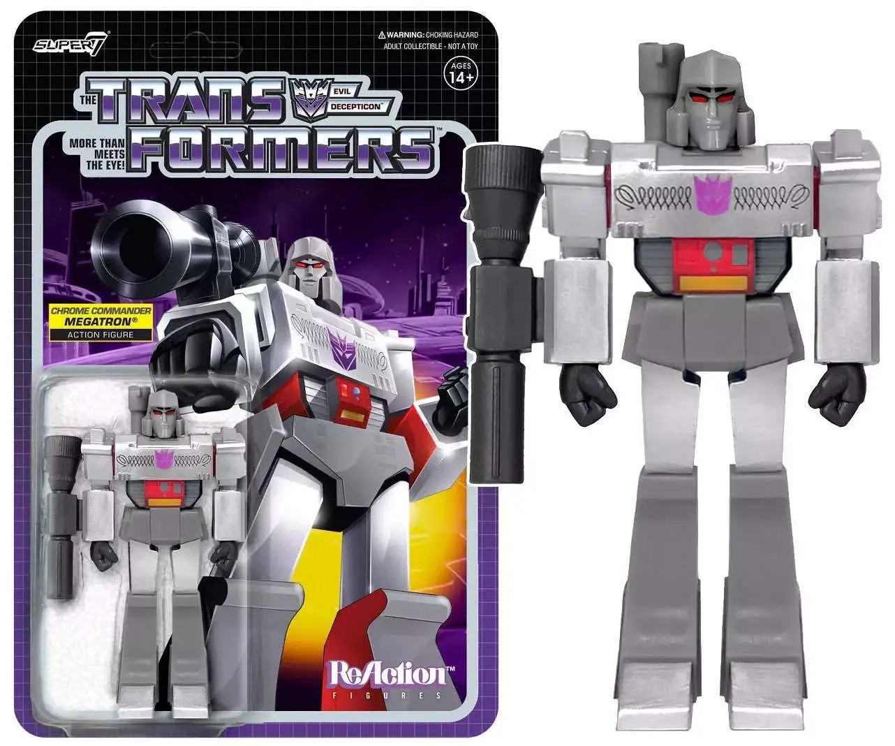 “Robots in disguise!” The Super7 x Transformers collaboration expands as the Autobots and Decepticons join the 3.75-inch ReAction Figure world! Collect them all! Transformers collectible figures available in various styles and characters. Megatron, founder of the Decepticon uprising, comes in a special re-color version with Fusion Cannon accessory. Figure does not convert.
