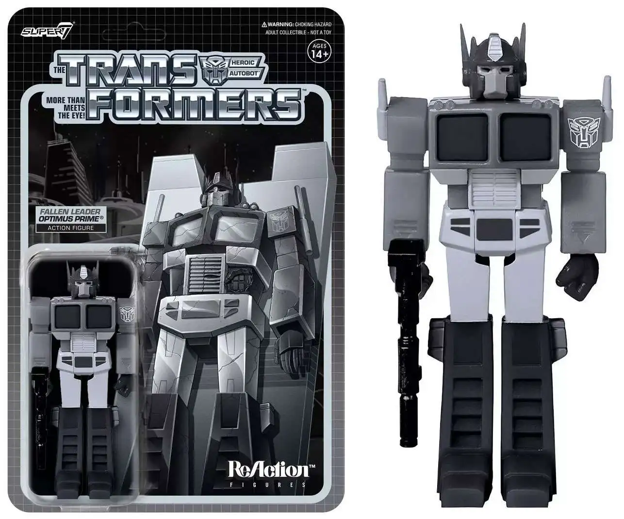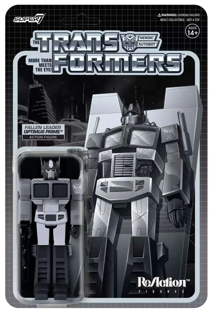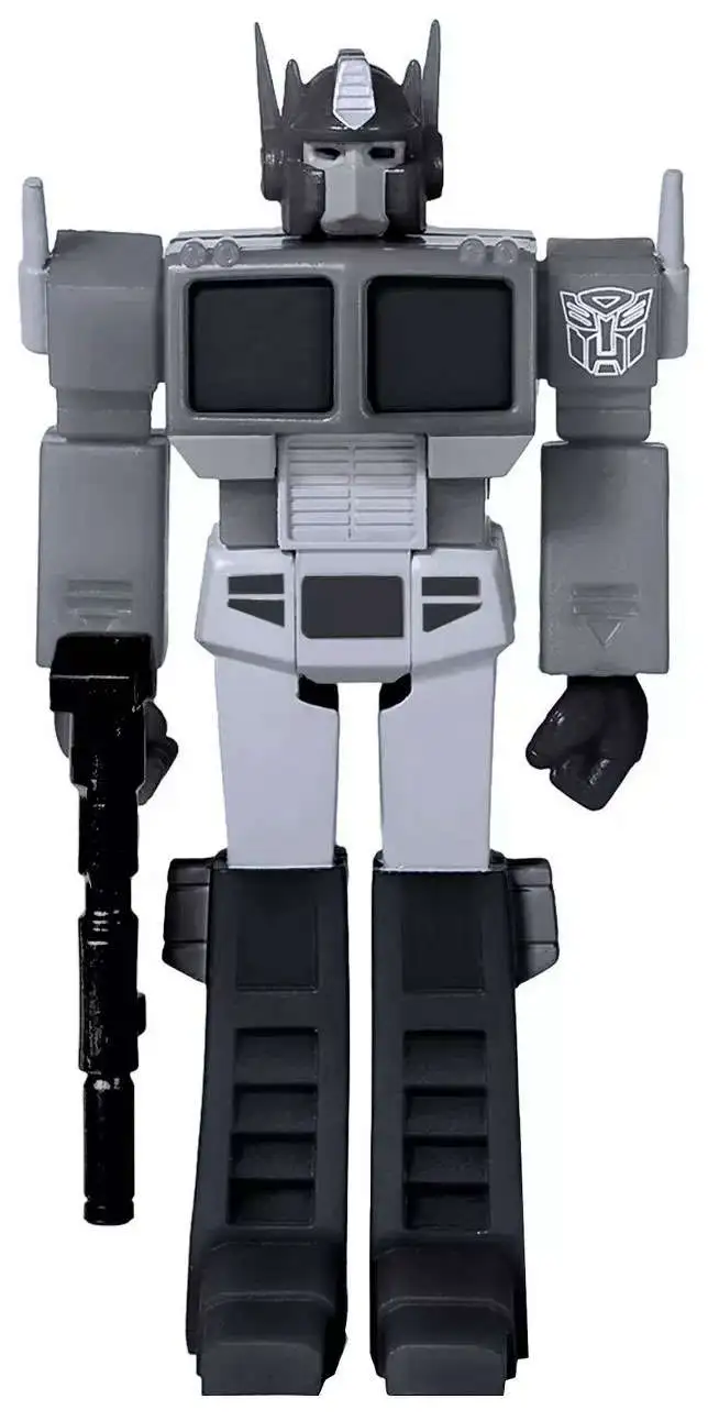 “Robots in disguise!” The Super7 x Transformers collaboration expands as the Autobots and Decepticons join the 3.75-inch ReAction Figure world! Collect them all! Transformers collectible figures available in various styles and characters. Optimus Prime, leader of the Autobots, comes in a special re-color version with Ion Blaster accessory. Figure does not convert.