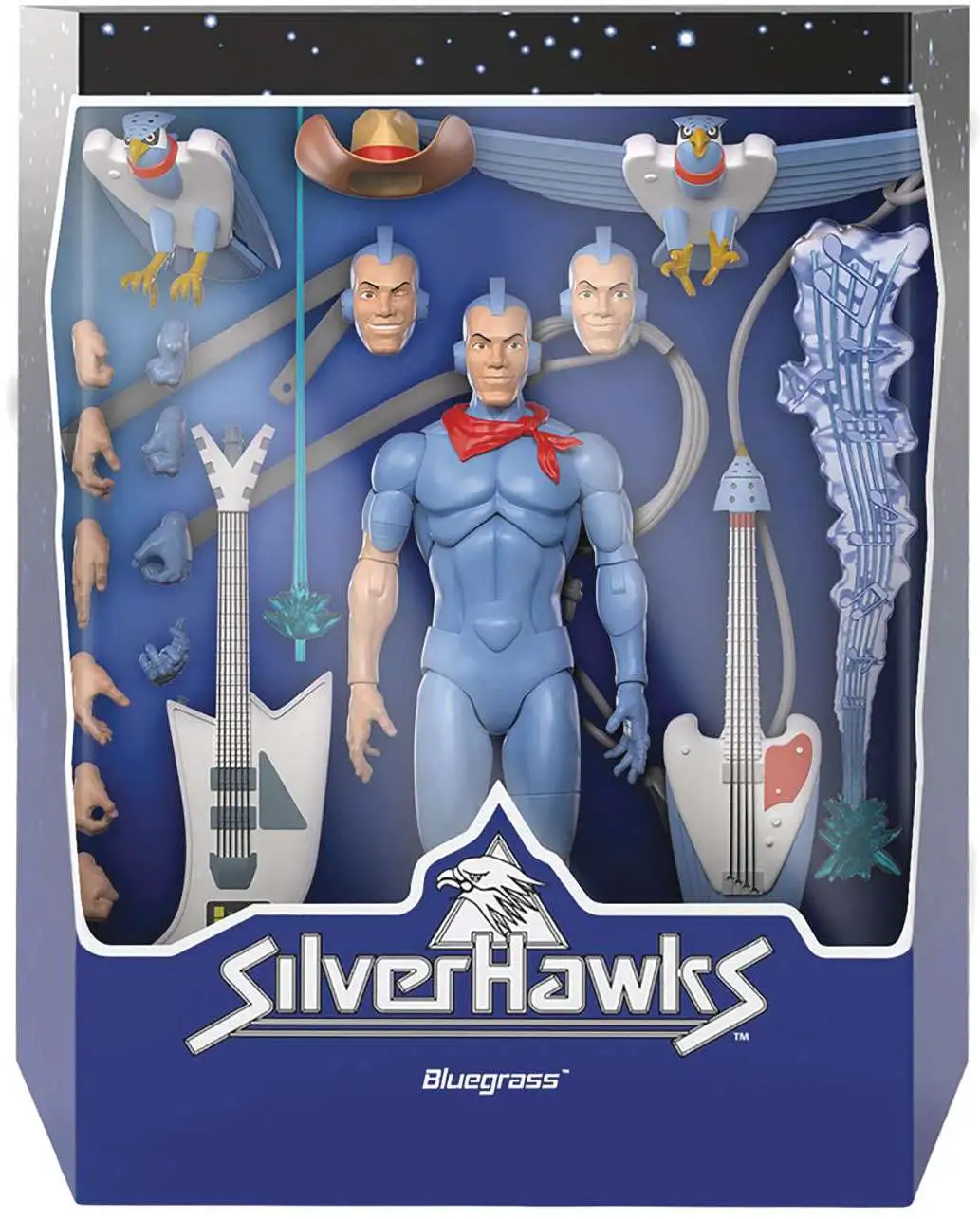 Bluegrass is the only SilverHawk whose cyborg enhancements don’t include wings or built-in weapons, but he’s an ace pilot who – with his Hot Licks guitar and “bird” partner Sideman – helps keep Limbo safe from Mon*Star and his mobsters! This made-to-order 7″ scale fully articulated SilverHawks ULTIMATES! figure of Bluegrass features premium detail and comes with interchangeable heads & hands, and a variety of other accessories, including a Hot Licks guitar, a pair of lassos, and a trio of Side Man figures. Adding Bluegrass to your collection will be just the tuneup that your collection needs, so snag this Bluegrass ULTIMATES! figure before it flies away!
