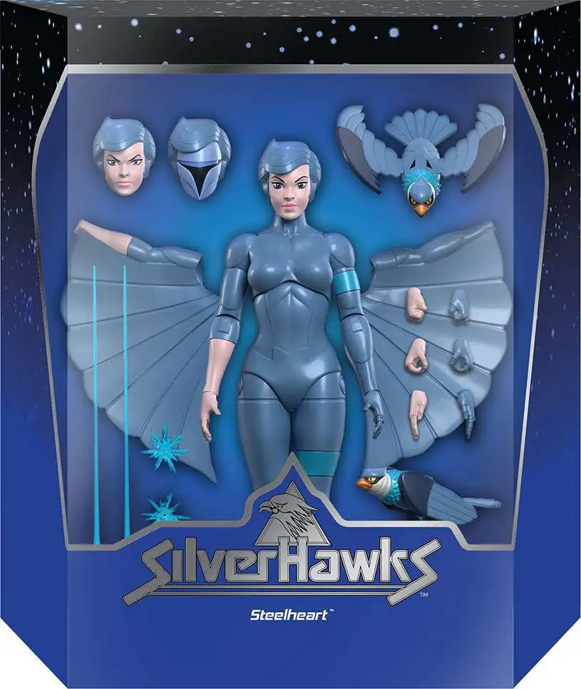 From Super7. One half of the Hart twins, Sgt. Emily “Steelheart” is not only one of the strongest members of the SilverHawks, but her technological prowess helps keep them one step ahead of Mon*Star and his mob goons. This cartoon-accurate, made-to-order 7″ fully articulated Steelheart ULTIMATES! figure comes with interchangeable heads and hands and a variety of accessories, including two versions of her cyborg bird companion, Rayzor! Kick off your SilverHawks collection with Steelheart and the rest of the first wave of ULTIMATES! Figures!