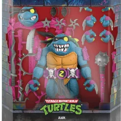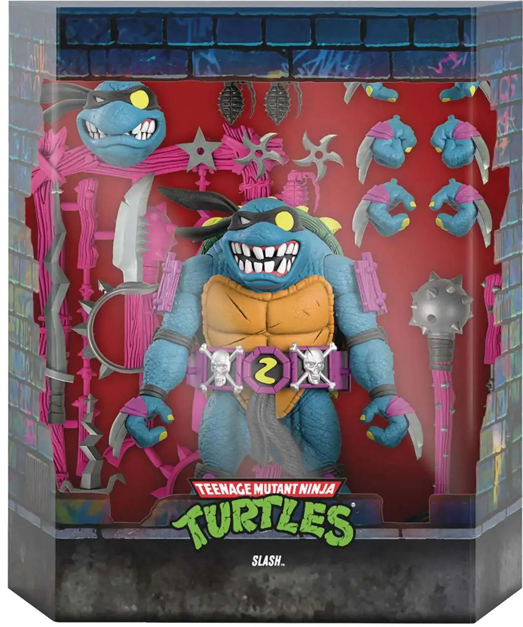 The Evil Turtle from Dimension X! Between his spiky shell, claws, and blade-adorned hands and not to mention, his bad attitude – it’s easy to see how Slash got his name. This 7″ scale fully articulated Teenage Mutant Ninja Turtles ULTIMATES! figure of Slash features battle damage and scaly skin detail, as well as interchangeable heads and hands, and a weapon rack chock full of mayhem-making accessories. He may hate pizza, parties, and pranks, but give the guy a chance and add the Teenage Mutant Ninja Turtles ULTIMATES! figure of Slash to your collection anyway!