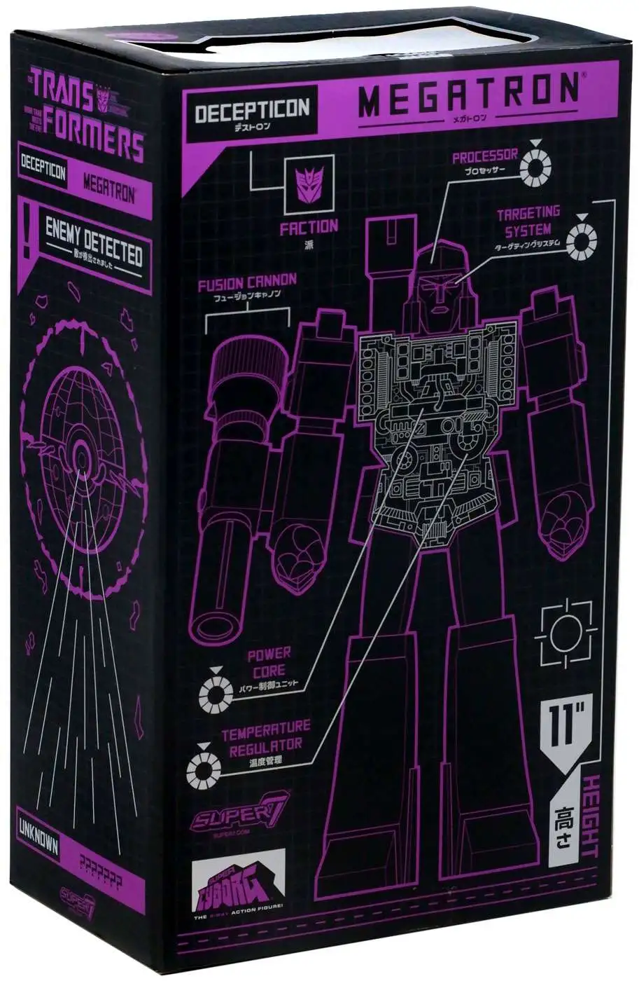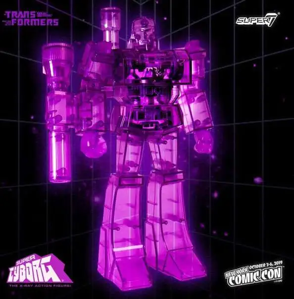 The evil leader of the Decepticons is a Generation One Cartoon-Accurate 12″ poseable action figure with fusion cannon and removable chest plate, showcasing his robotic innards. This X-Ray edition Super Cyborg Megatron is cast in clear purple plastic with painted inner torso, and packaged in a deluxe window box.